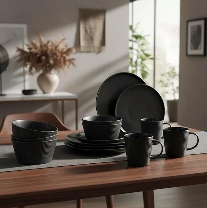 Red Velvet Vajilla de Cerámica - Set de 16 Piezas para 4 Personas | Platos Llanos, Platos de Postre, Cuencos de Cereal/Sopa y Tazas | Diseño Elegante, Resistente y para Uso Diario (NEGRO)